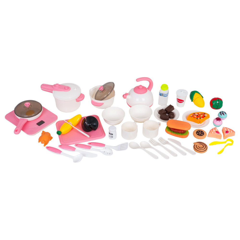 Setul include cuptor cu microunde, chiuvetă cu robinet, plită cu inducție, suport pentru vase, cuptor, aparat de cafea, frigider, suport pentru deserturi și o mulțime de accesorii: oale, tacâmuri, farfurii, ceainic, cești și alimente de jucărie. Robinetul funcționează cu apă reală, iar plita este iluminată, are afișaj de temperatură și emite sunete realiste de gătit și prăjit. Un alt efect captivant este aburul rece care iese dintr-una dintre oale.