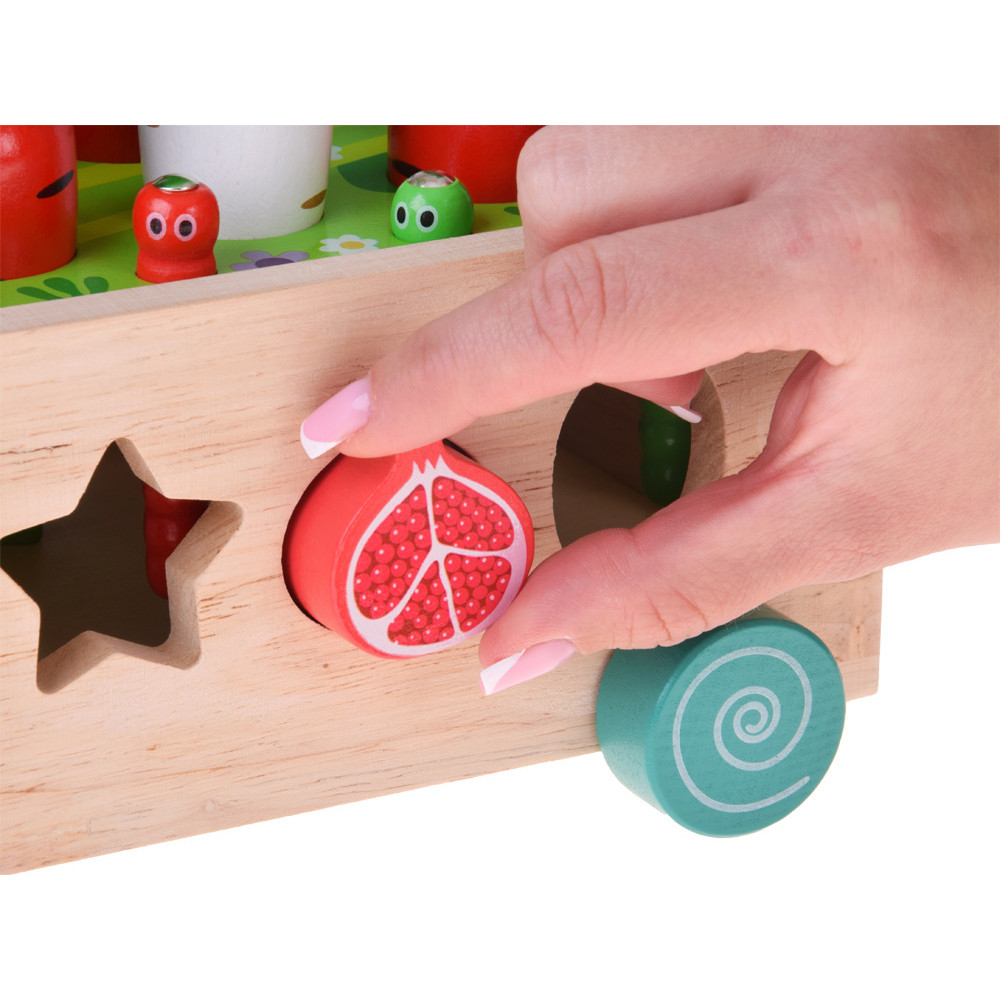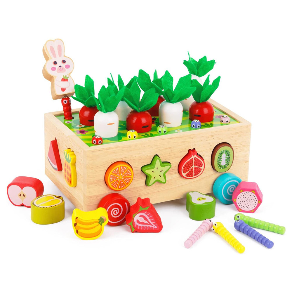 Copiii pot sorta forme, recunoaște culori și învăța denumiri de fructe și legume. Morcovii și viermișorii se pot trage, iar iepurașul magnetic adaugă un plus de distracție. Designul simplu, inspirat din metoda Montessori, dezvoltă motricitatea fină, gândirea logică și coordonarea mână–ochi.