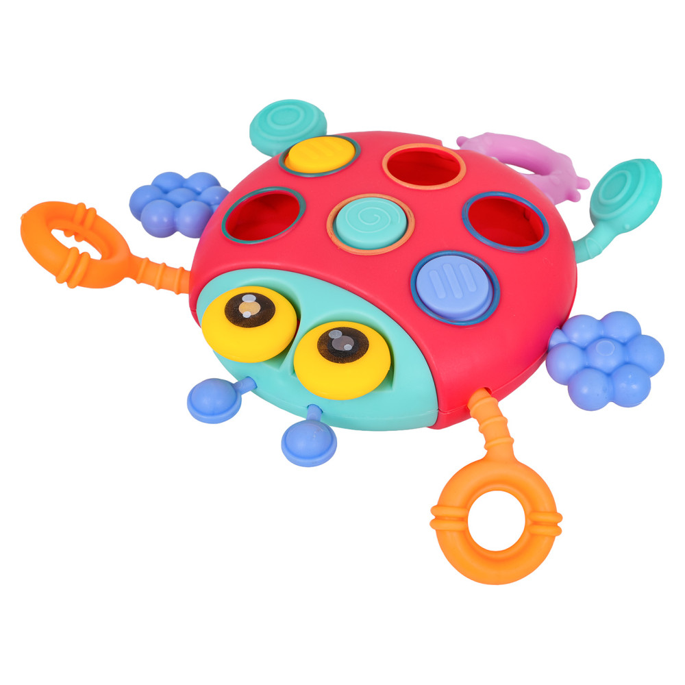 Forma de buburuză stimulează interacțiunea copilului pe mai multe niveluri. Proeminențele texturate sunt ideale pentru mestecat, iar elementele de tras, împins și rotit antrenează mâinile și dezvoltă abilitățile cognitive.