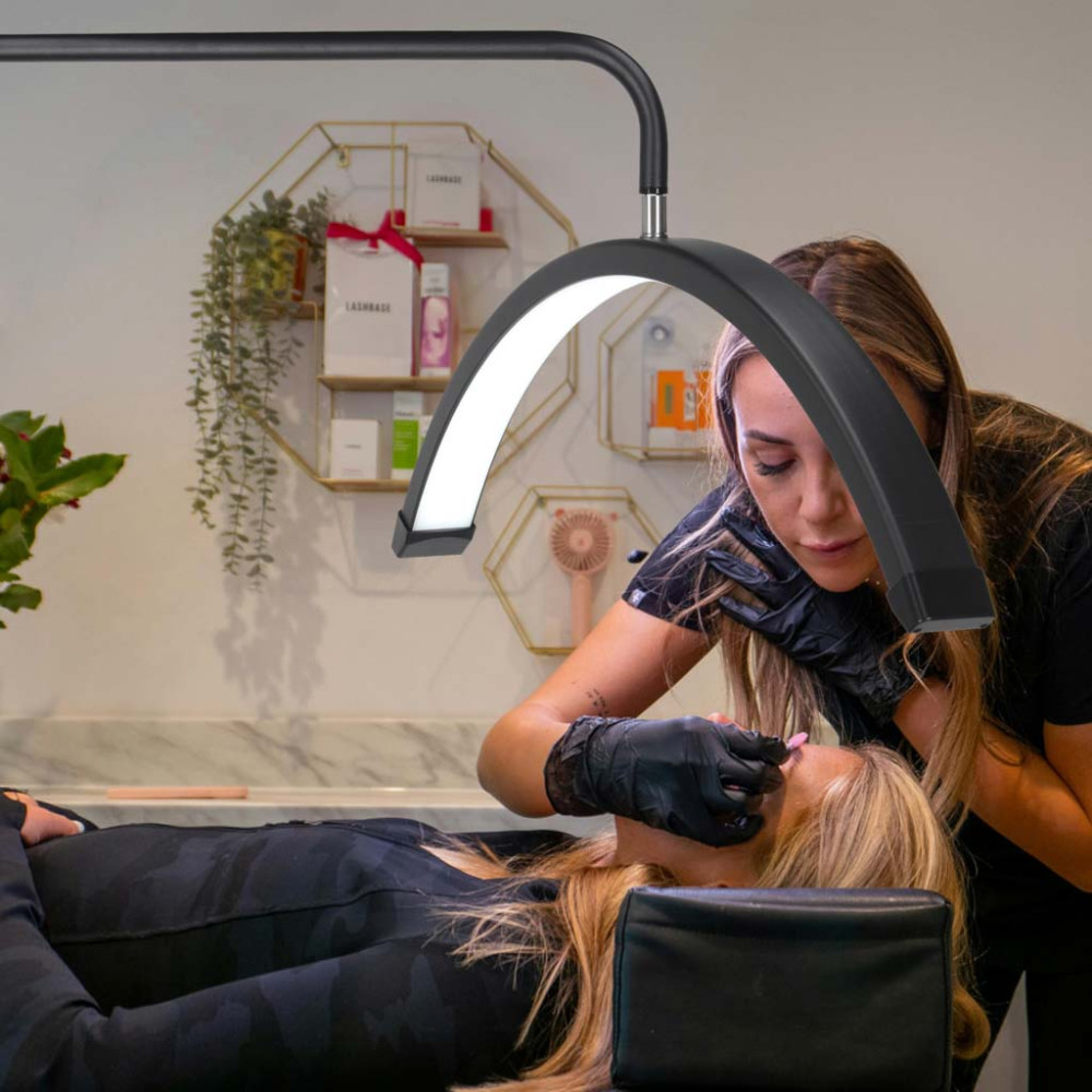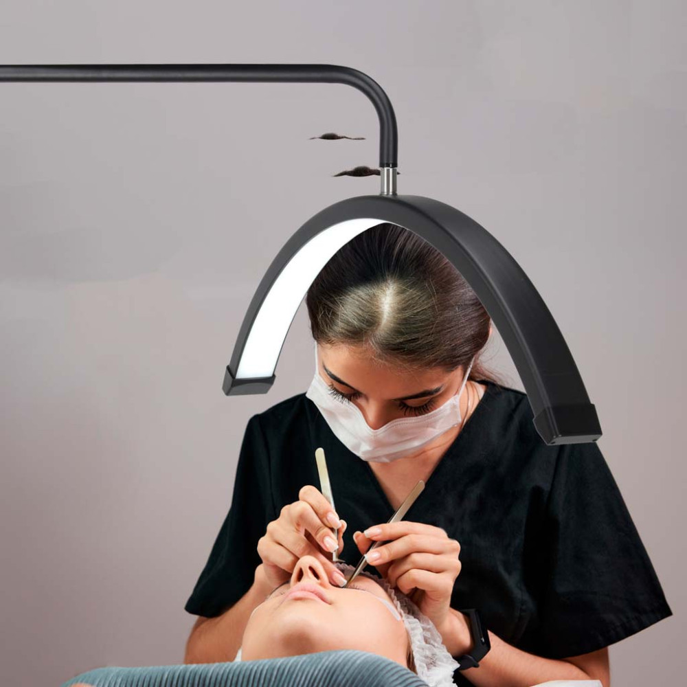 Lampa cosmetică profesională LED, cu design modern în formă de arc și iluminare reglabilă, oferă condiții optime de iluminare pentru diverse activități de înfrumusețare..