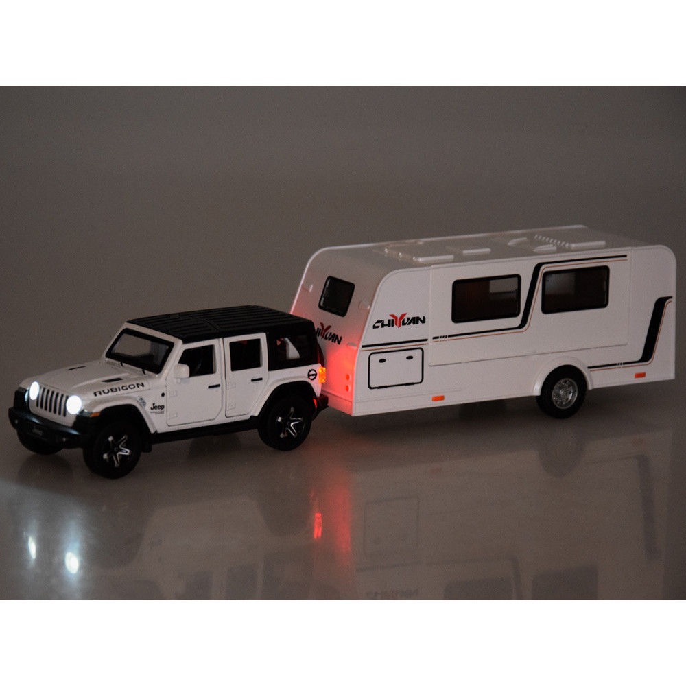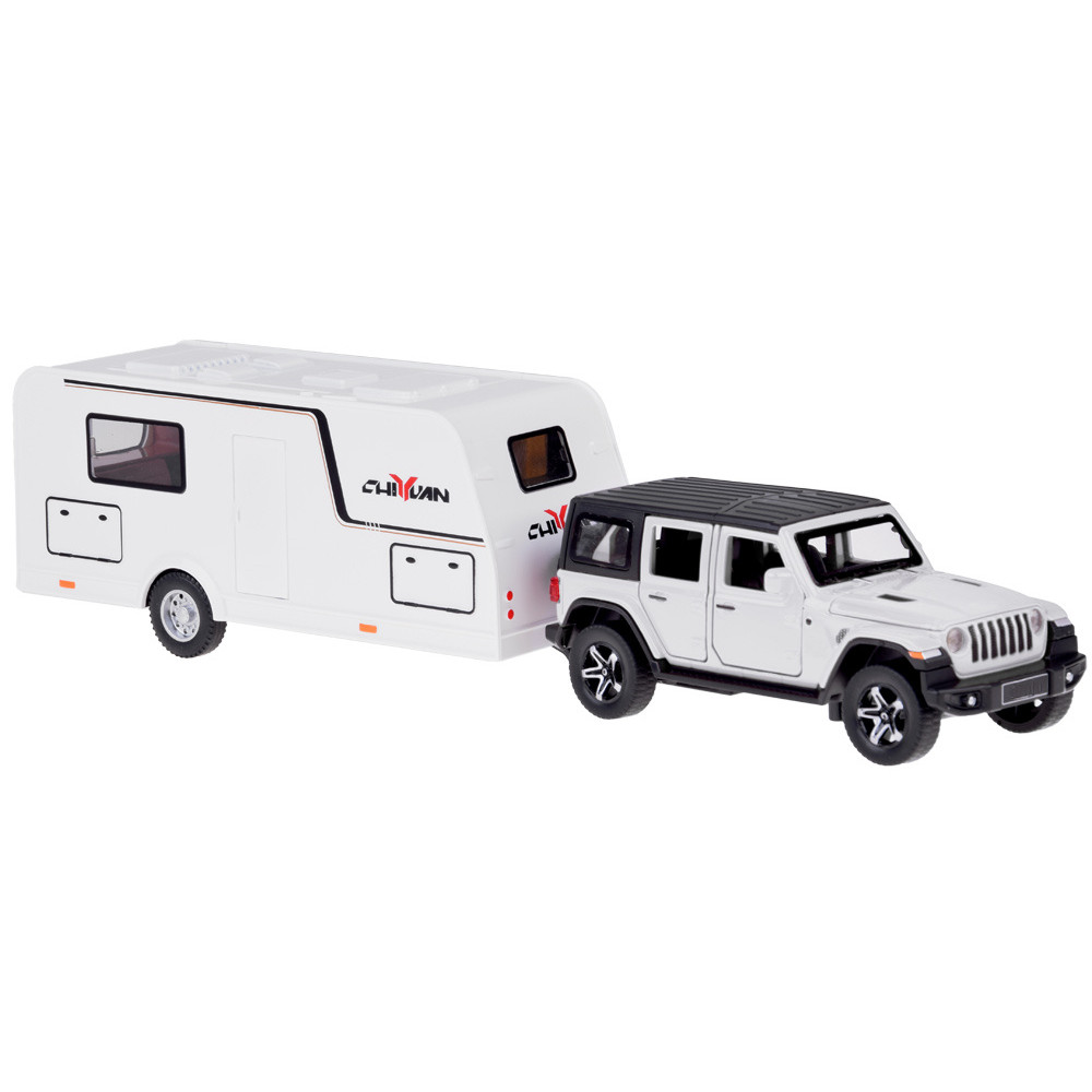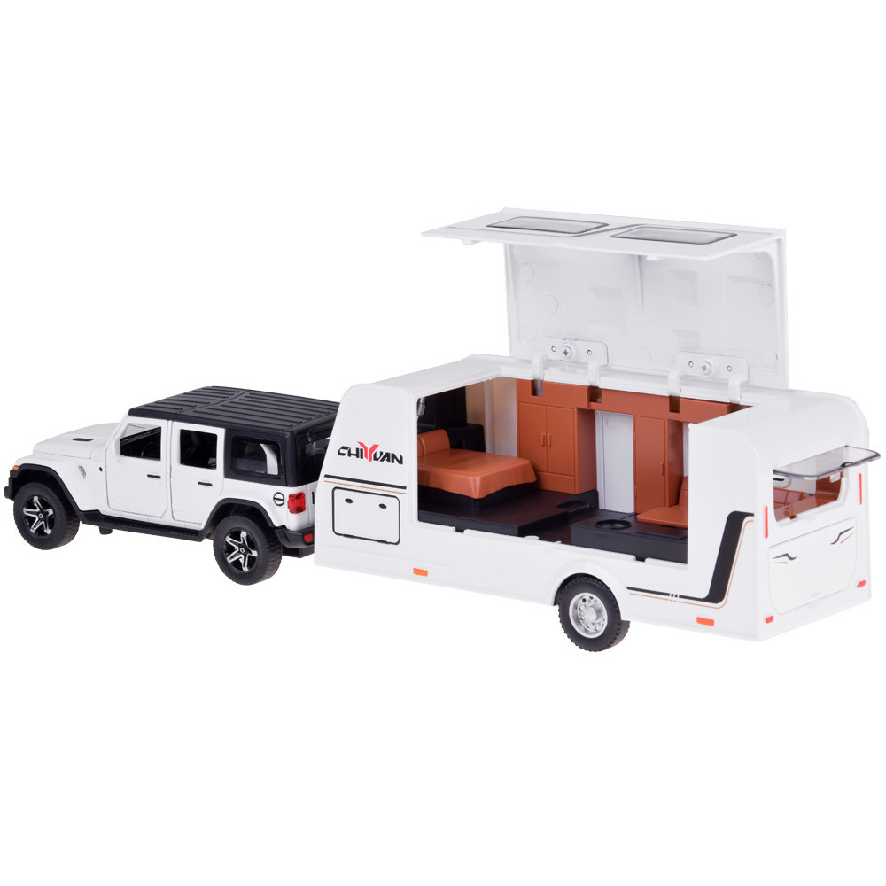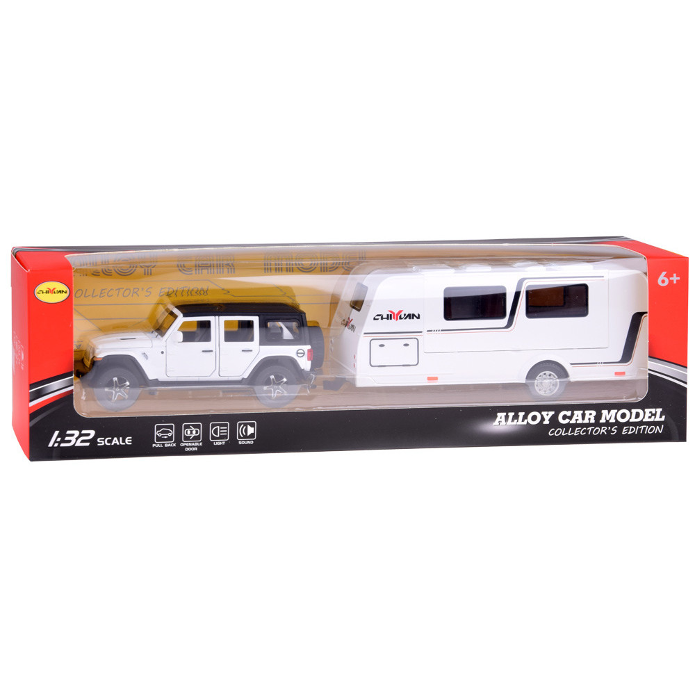 Mașină de teren cu rulotă – ALLOY CAR MODEL – model interactiv din aliaj, în culoarea albă