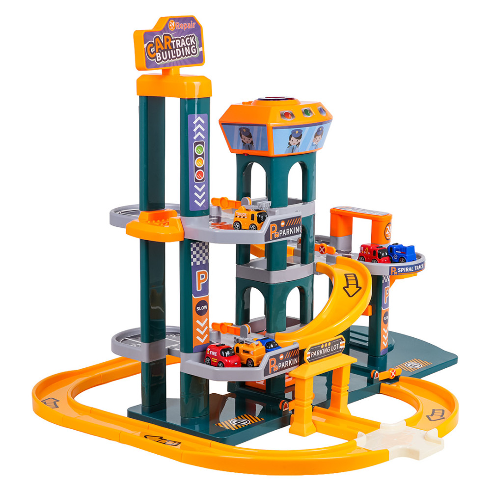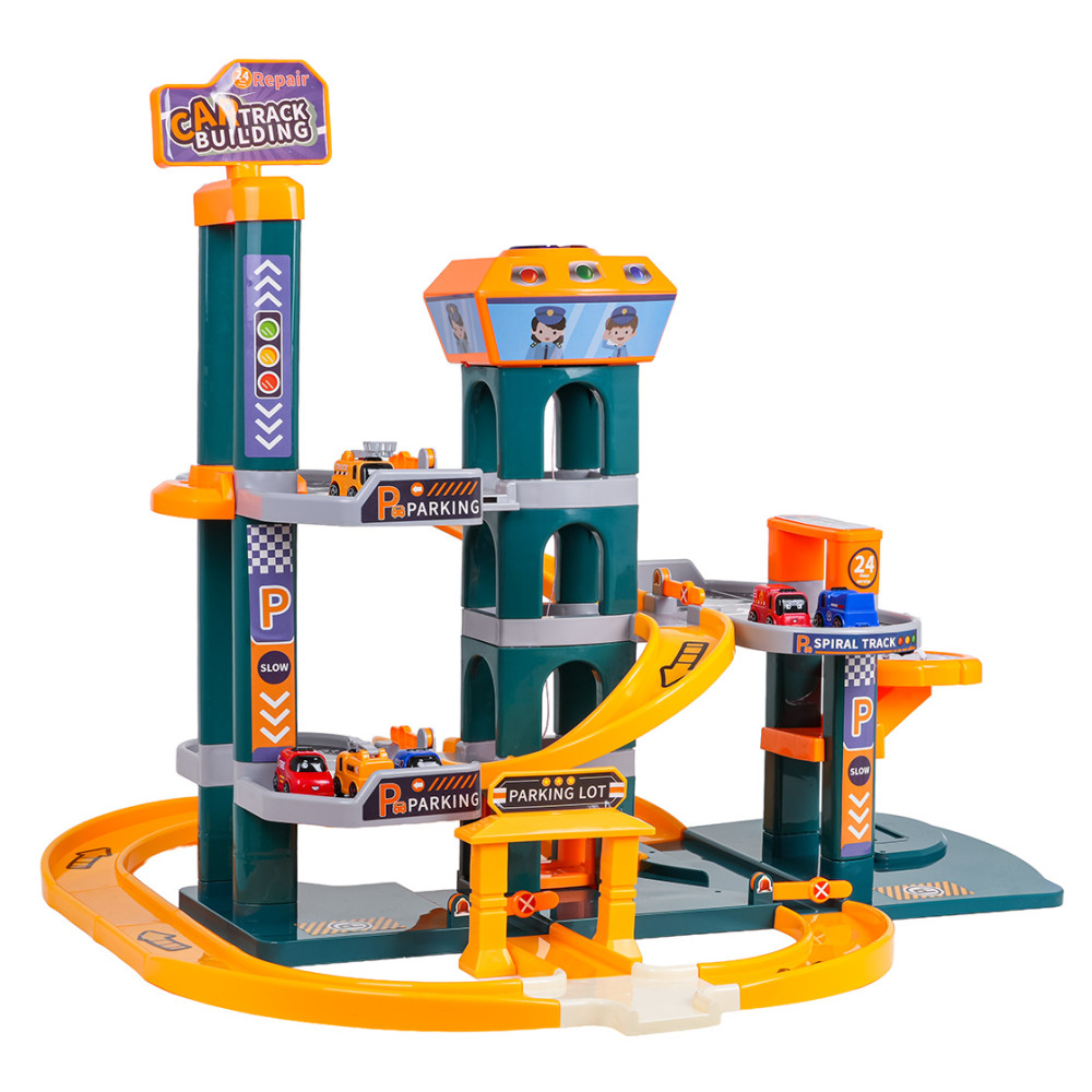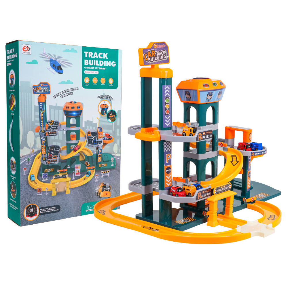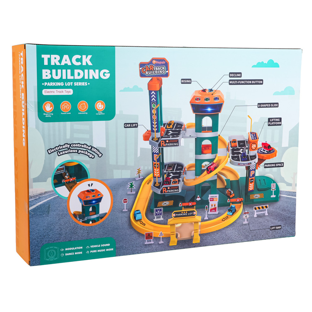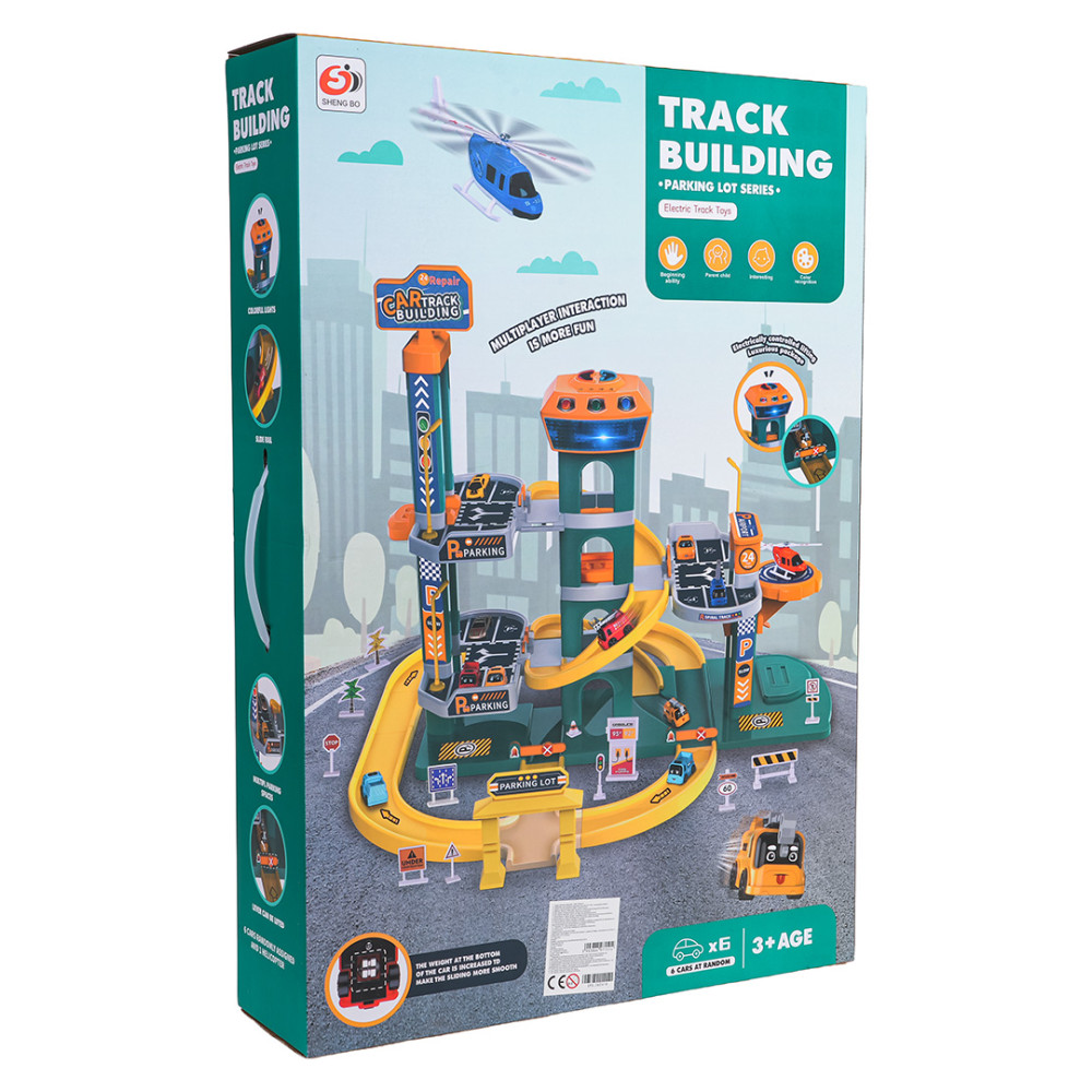 Această parcare realizată cu efecte sonore și luminoase este destinată copiilor de la 3 ani. Setul este fabricat din materiale de cea mai bună calitate, sigure pentru copii, și se remarcă prin culori vii și atrăgătoare. Parcarea are două niveluri, fiecare cu locuri de parcare. Accesul la acestea este asigurat printr-un lift electric alimentat cu baterii. În partea superioară a liftului se află un panou de control pentru intrare și ieșire, cu efecte sonore precum melodii vesele, sunete de vehicule, sirene și funcții interesante, cum ar fi butoane luminoase pentru acces. Mașinile pot fi coborâte cu liftul sau pe rampe. Setul include 6 vehicule și un elicopter. De asemenea, sunt incluse mai multe felinare stradale, semne de circulație și bariere.