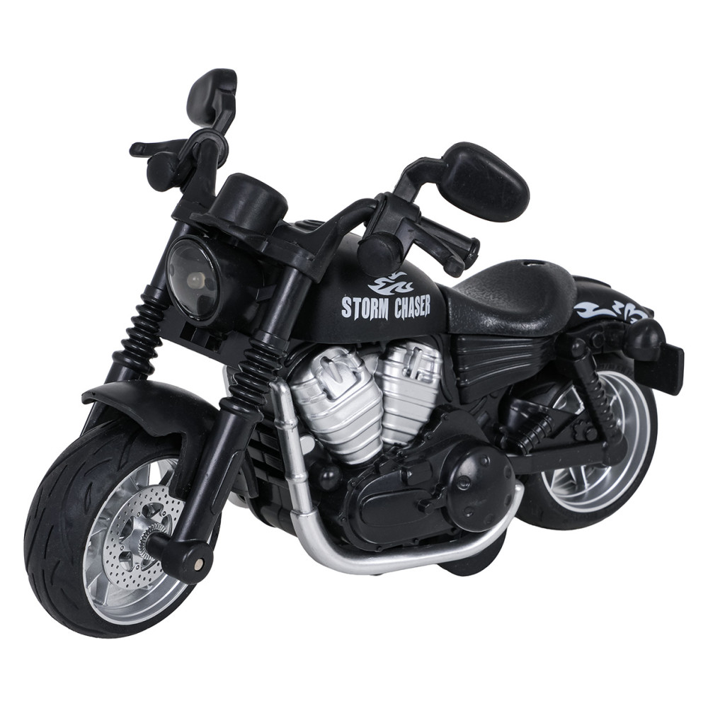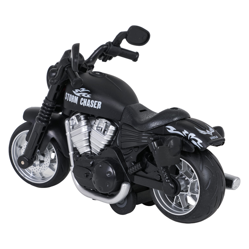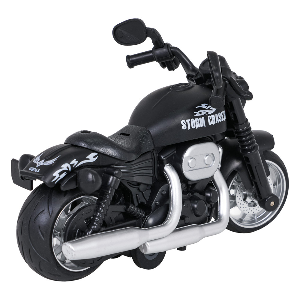 Motocicletă cu efecte sonore și luminoase și propulsie motorizată, potrivită pentru copii de la 3 ani. Modelul este realizat cu atenție la detalii, având caroserie metalică și anvelope din cauciuc cu aderență excelentă. Jucăria este echipată cu un motor cu arc, iar prin apăsarea roții din spate se activează sunetele motorului și farurile intermitente. Jucăria funcționează cu baterii.