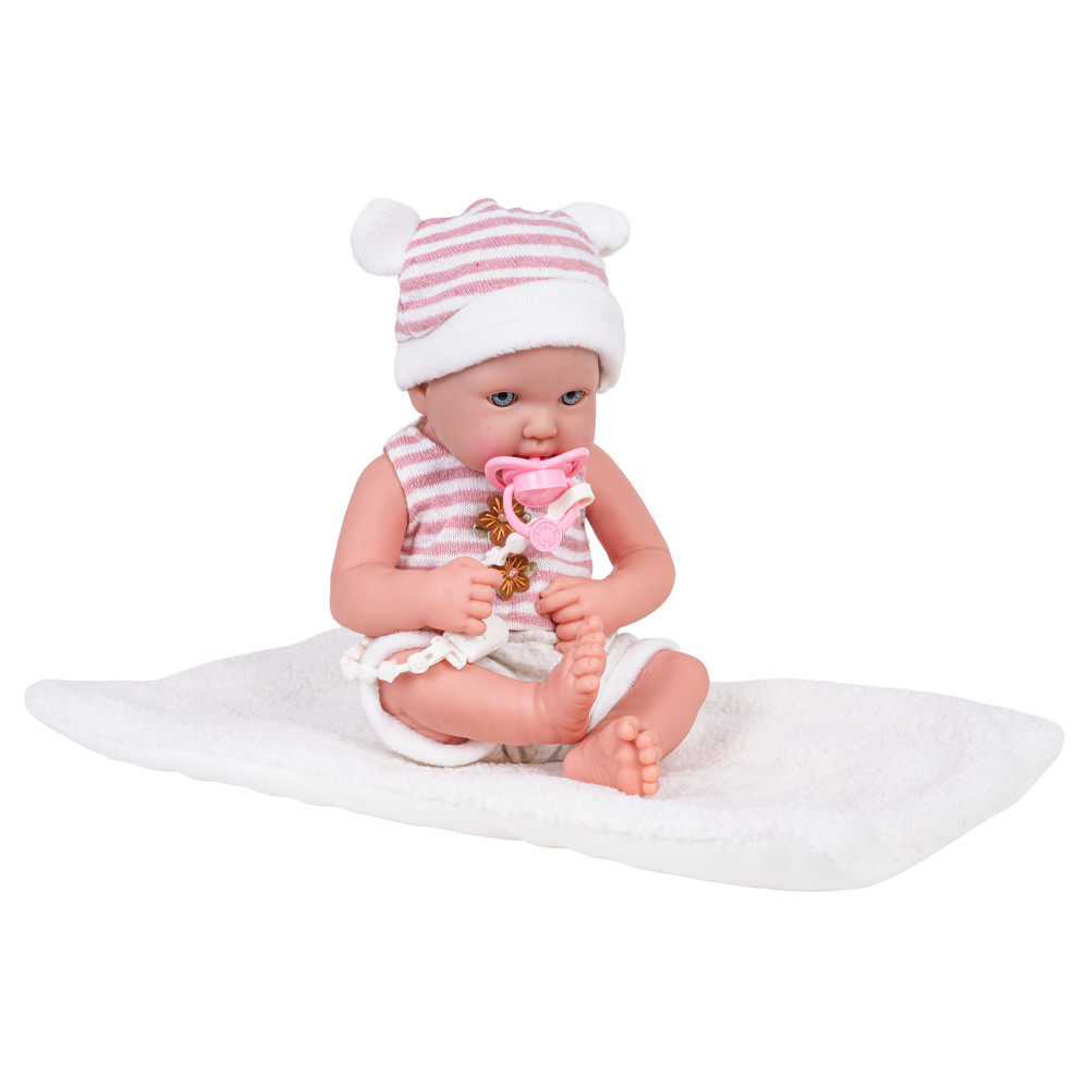 Păpușa poartă o căciuliță, un tricou și pantaloni scurți. Are brațe și picioare mobile și este foarte moale la atingere. Setul include o suzetă cu șnur și o pătură moale. Păpușa are un aspect incredibil de realist, exact ca un bebeluș adevărat.