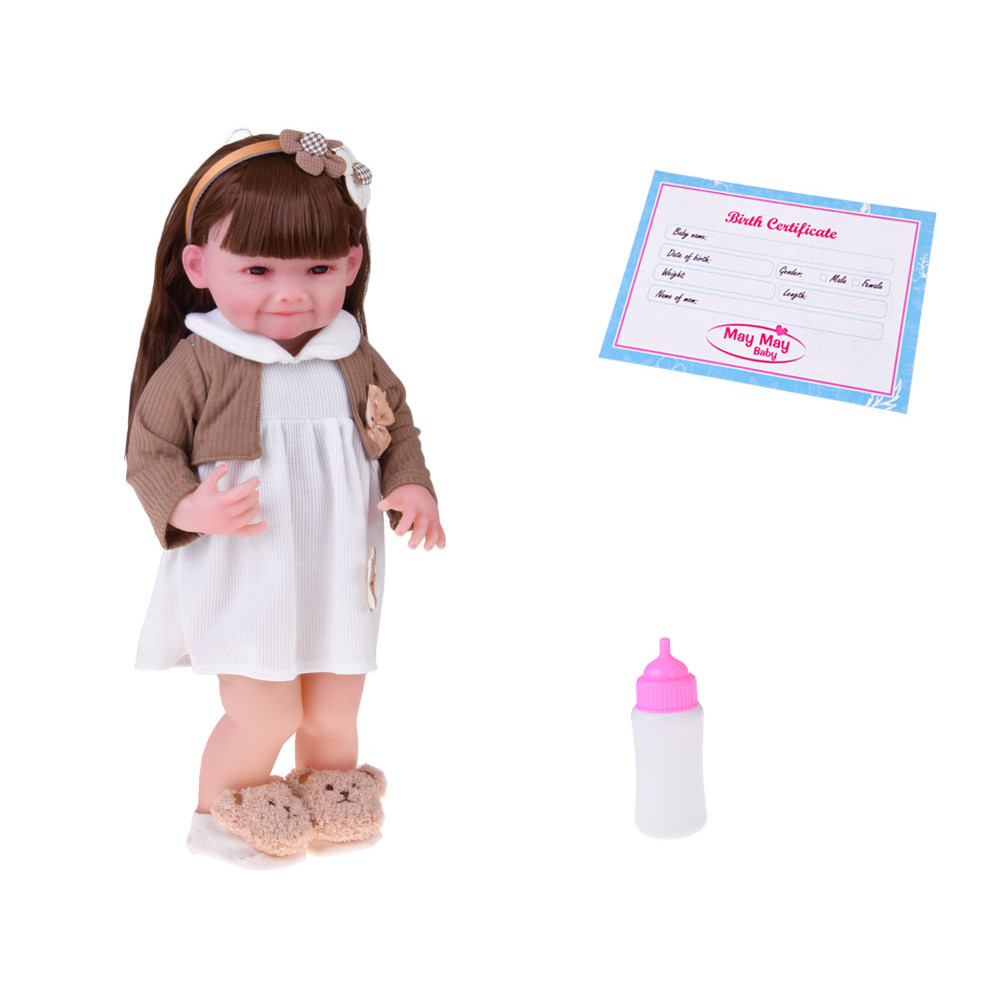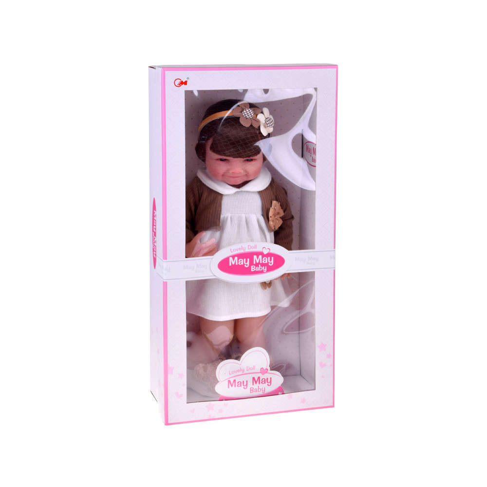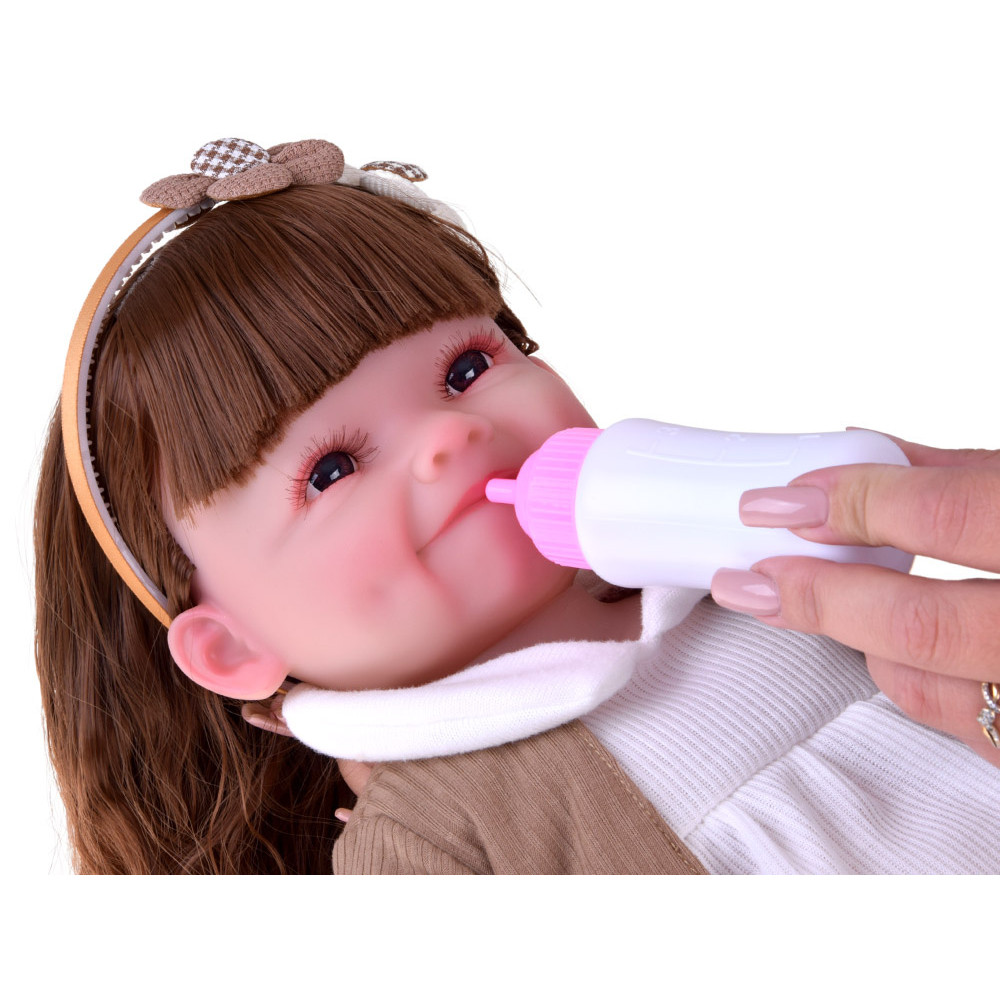 Păpușa fermecătoare are aproximativ 55 cm, păr lung castaniu ce poate fi pieptănat și ochi mari căprui.