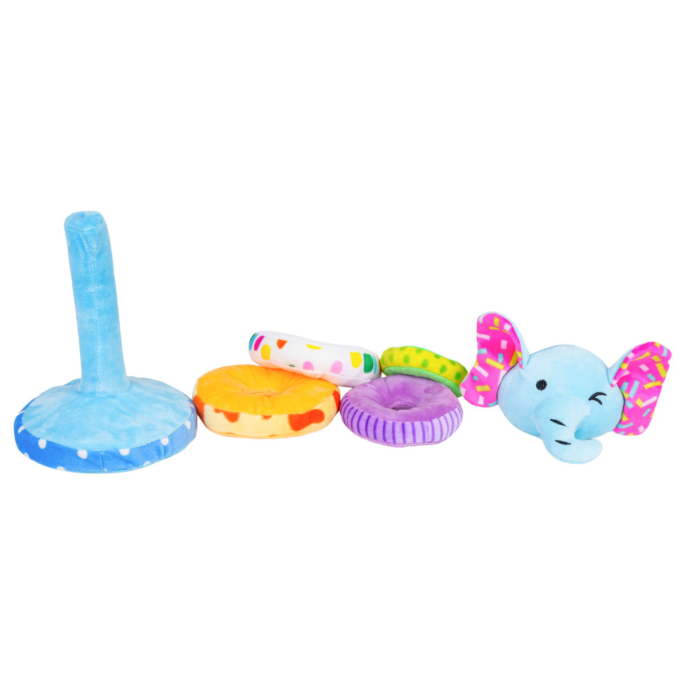 Această jucărie educativă este realizată din material plușat de înaltă calitate, plăcut la atingere, cu culori intense care atrag privirea copilului și stimulează curiozitatea și dorința de joacă. Setul include o bază, patru inele moi de dimensiuni variate și un cap de elefant. În interiorul capului este integrat un dispozitiv sonor care emite un sunet delicat la apăsare, oferind o stimulare auditivă suplimentară.