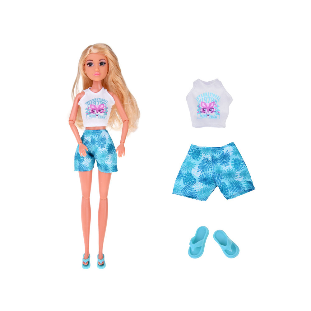 Pregătiți-vă pentru aventuri de vară cu acest set colorat de haine pentru păpuși! Setul include două ținute estivale: o rochie hawaiană cu flori, ușoară și plină de culoare – perfectă pentru plajă sau petreceri de vară – și un crop top alb cu pantaloni scurți cu imprimeu de frunze, confortabil și stilat pentru zilele călduroase.