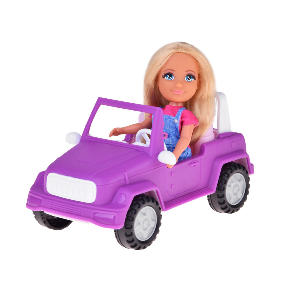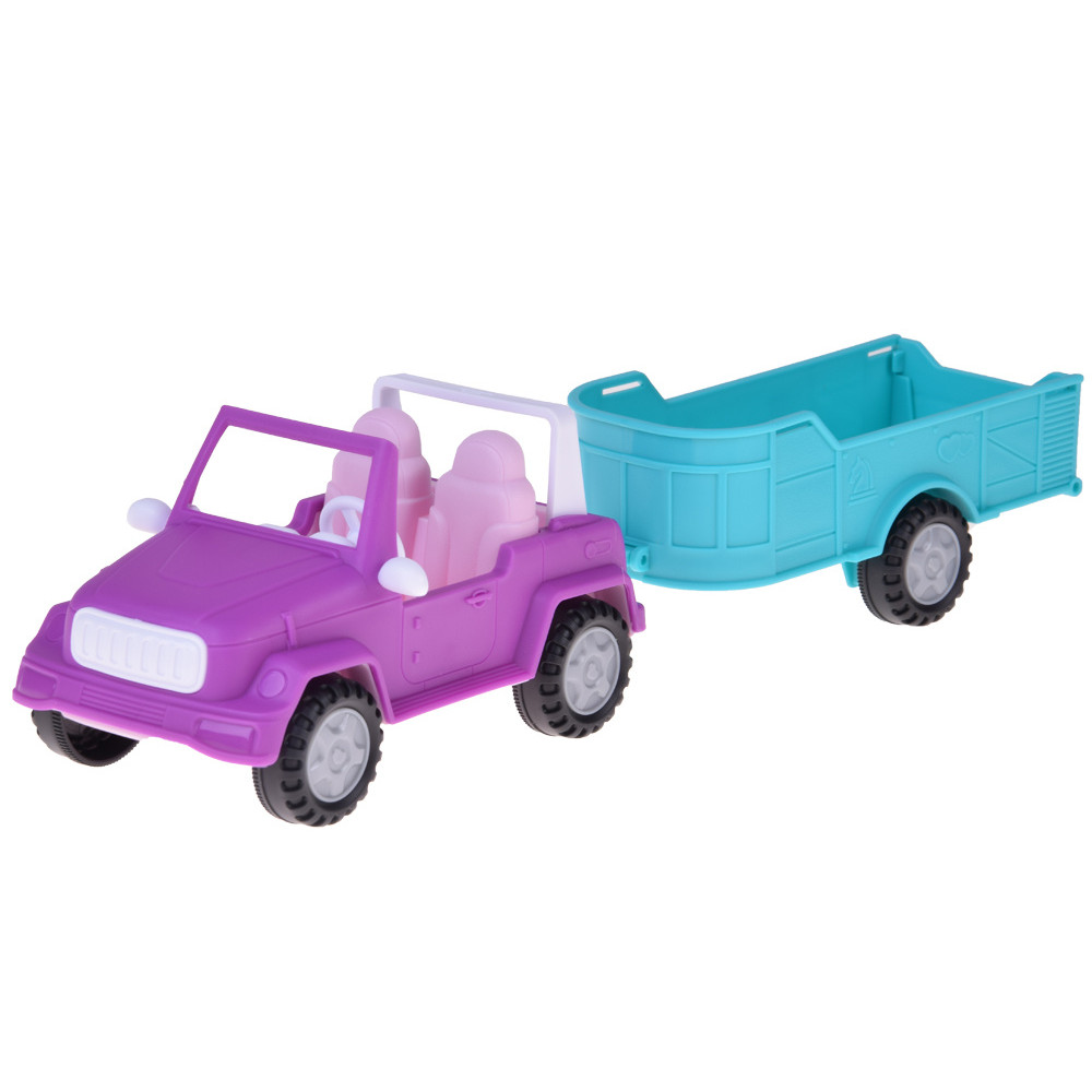 Setul include un vehicul off-road roz, echipat cu volan și roți mobile. Mașina atrage atenția prin combinația de culori roz și mov, precum și prin detalii adorabile, cum ar fi inima din centrul jantei. Este suficient de adâncă pentru a așeza păpușa, iar picioarele acesteia încap sub capotă.
