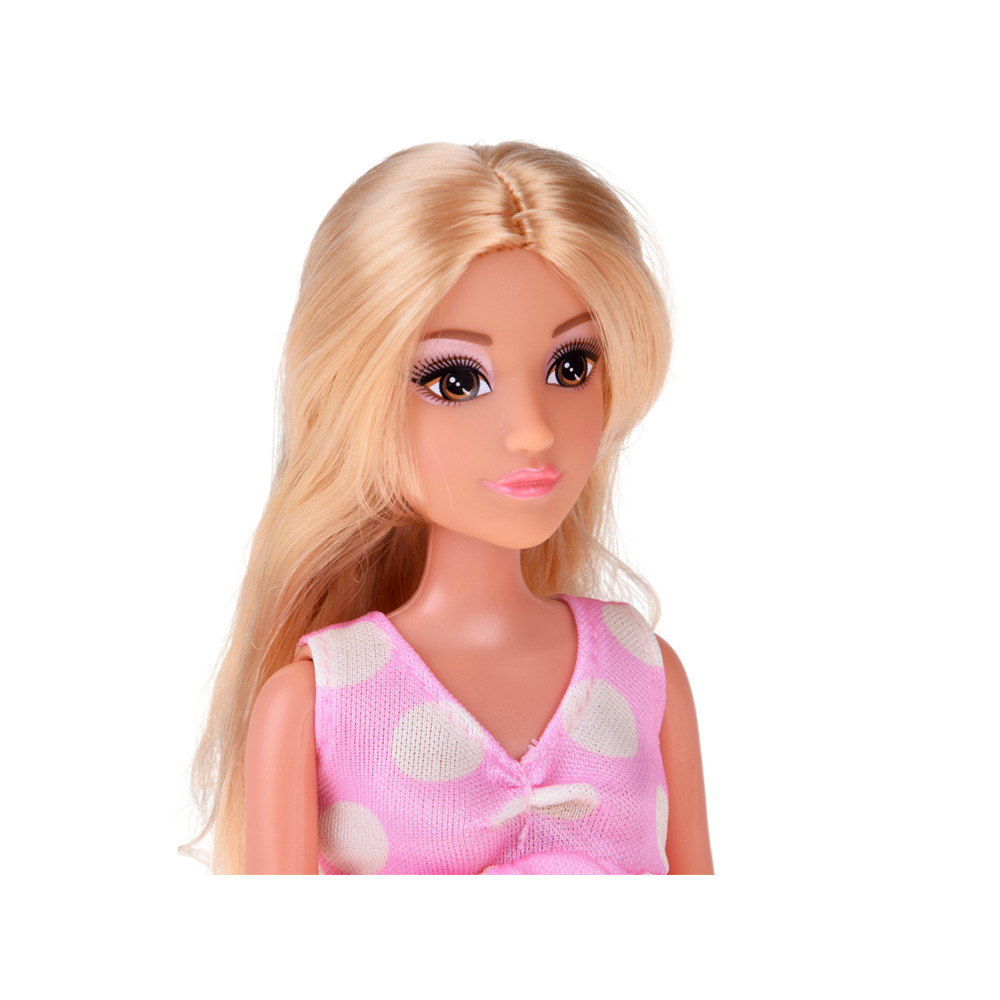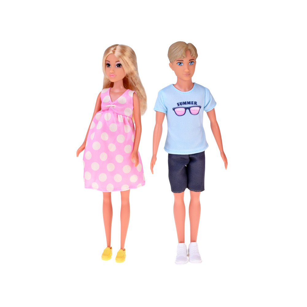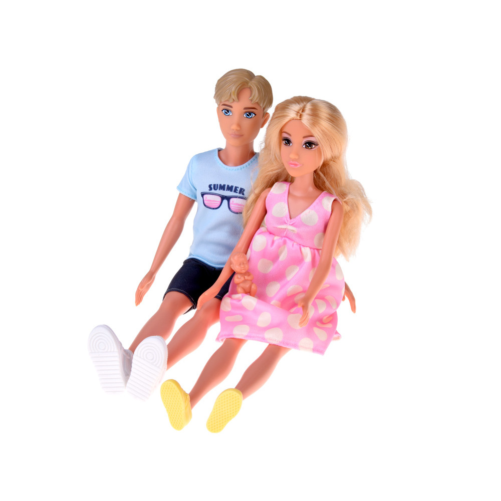 Păpușa tată are păr blond și ochi albaștri, îmbrăcat lejer într-un tricou albastru, pantaloni scurți și pantofi sport albi. Păpușa mamă are păr lung, blond, ușor de coafat, ochi căprui accentuați de un machiaj delicat și poartă rochie roz de maternitate cu buline și teniși galbeni. Ambele păpuși au membre mobile, iar burtica mamei se deschide pentru a scoate bebelușul.