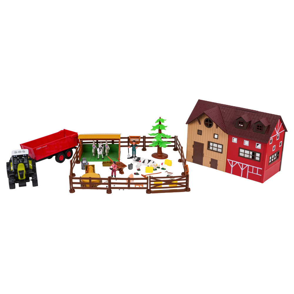 Include un hambar, o curte, animale, figurine de fermier și un tractor interactiv cu efecte sonore și luminoase.