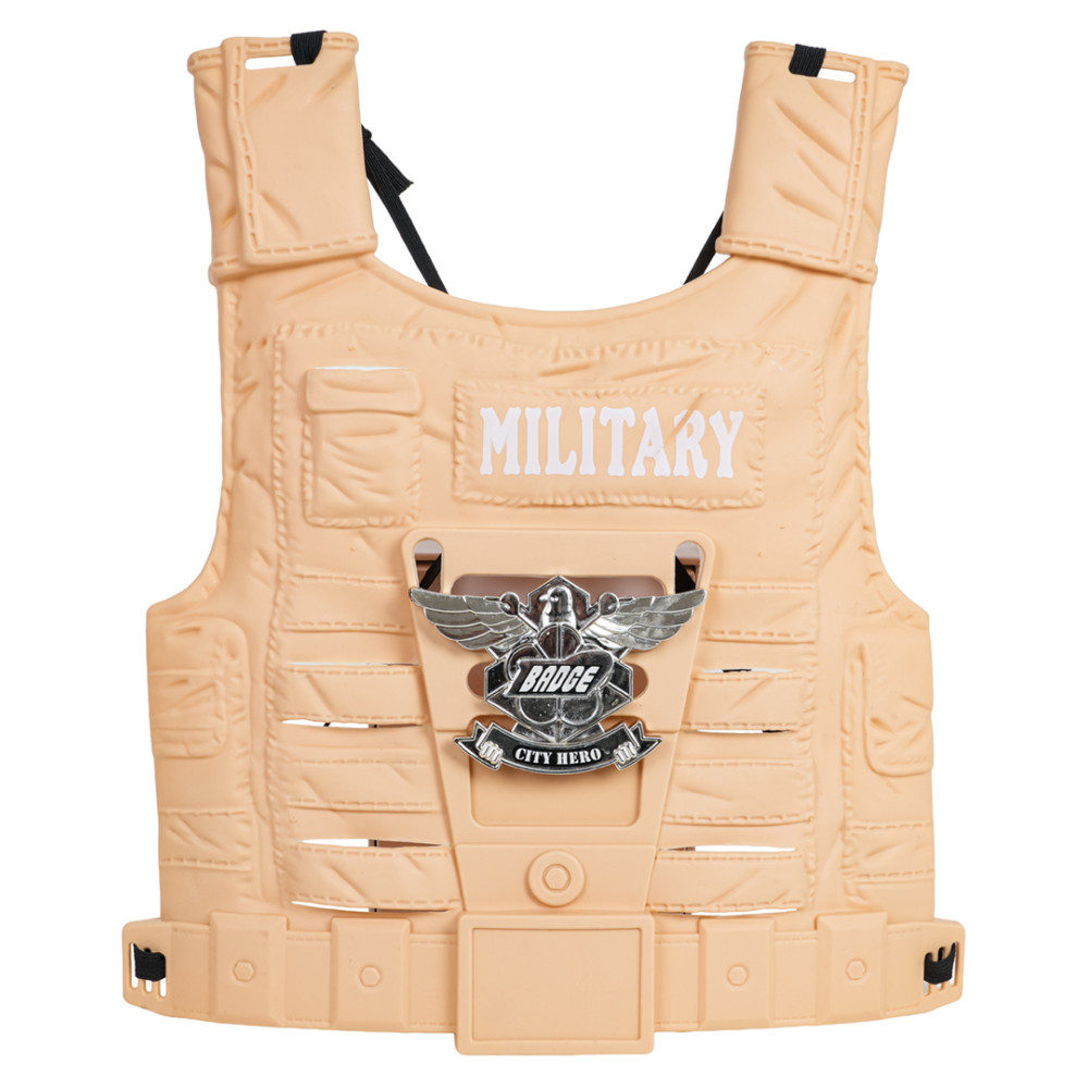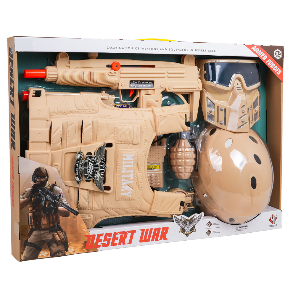 Set militar complet – pentru copii de la 3 ani Setul de 14 piese în nuanță nisipie le oferă copiilor o experiență realistă de joc de rol. Fabricat cu atenție la detalii, este ideal pentru joaca în aer liber. Pușca se activează manual: prin rotirea rotiței portocalii și apăsarea trăgaciului se declanșează sunetul de împușcătură. Funcționează cu baterii.