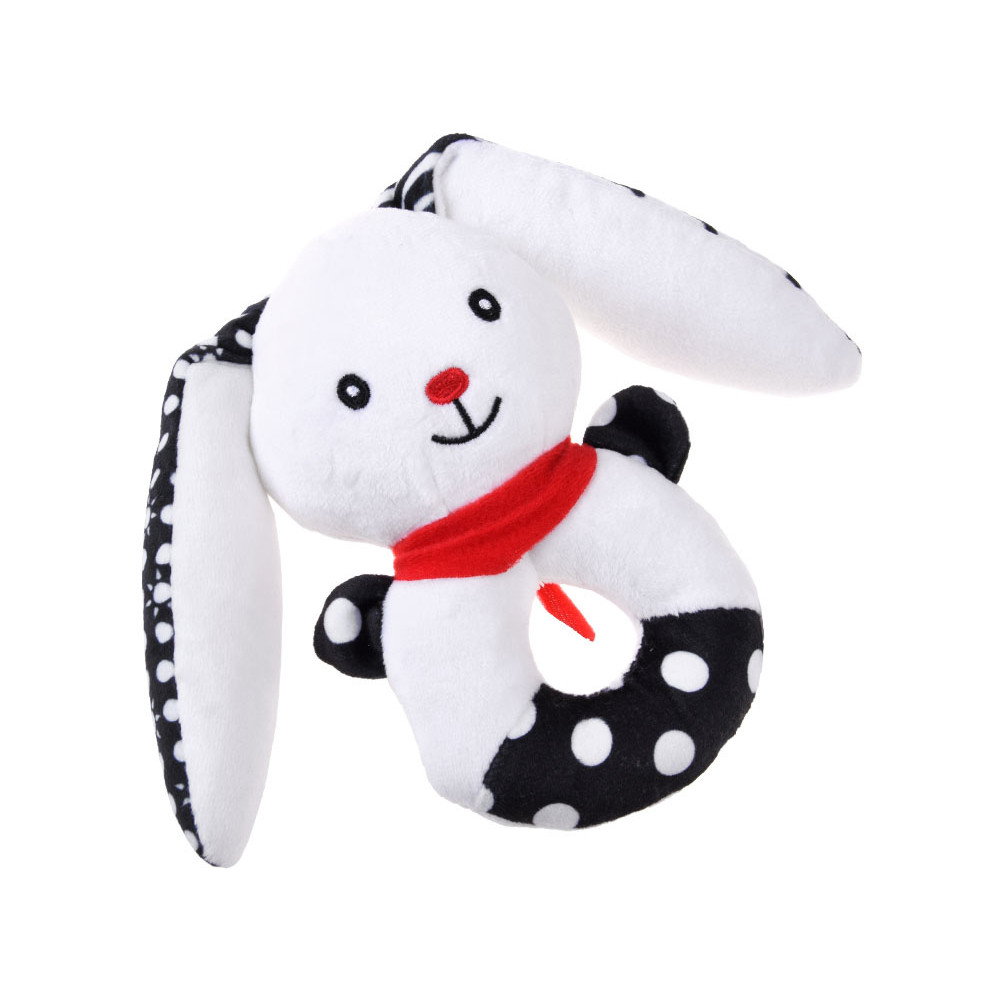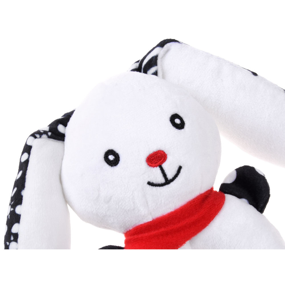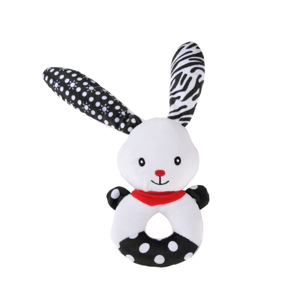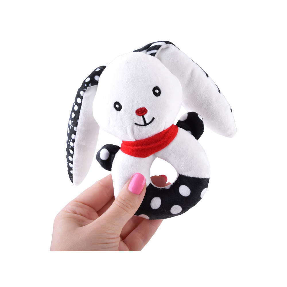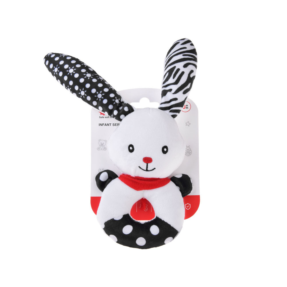 Acest iepuraș adorabil și zâmbitor esteo jucăria din pluș, a fost concepută cu grijă pentru nevoile celor mici. Are culori contrastante – alb și negru – și modele variate precum buline și soare. Detaliile roșii, precum nasul în formă de inimă, eșarfa și urechile, atrag atenția bebelușului. În primele etape ale dezvoltării, copiii nu disting toate culorile, de aceea jucăriile cu tonuri contrastante sunt mai ușor de recunoscut și mai atractive vizual. Iepurașul stimulează observarea, focalizarea vizuală și dezvoltarea cognitivă. Forma rotunjită, capul proeminent și urechile lungi sunt ideale pentru mâinile mici, sprijinind coordonarea motorie și dexteritatea. În interior se află clopoței și un fluier care emit sunete delicate, trezind curiozitatea și stimulând auzul.